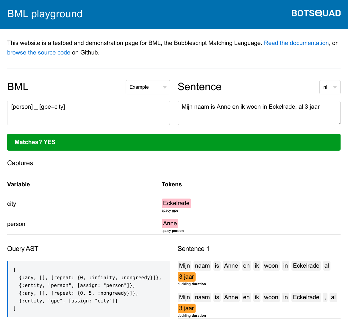 An interactive playground / experimentation area for BML is available on bml.dialox.ai. You can try out BML queries there and see how input sentences are tokenized in different languages, and how entities are recognized.