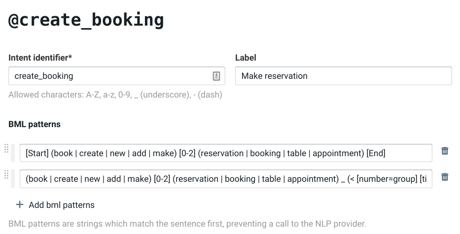 Alternatively, intents can also be defined in Bubblescript code directly. BML patterns can be used there as well: